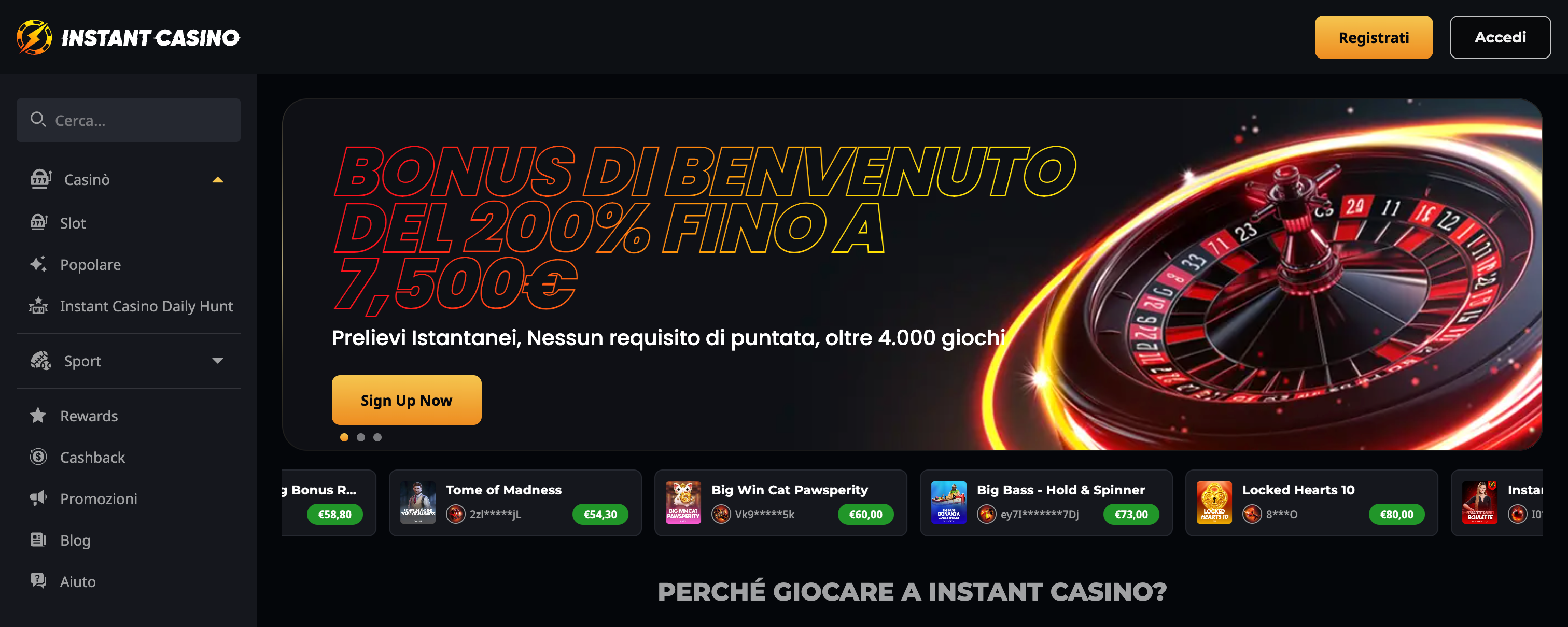 Molti arrivano cercando il brand Instant, altri usano casino instant per trovare accesso rapido da smartphone. Chi punta direttamente all'area conto digita instant casino login e poi passa al catalogo per confrontare bonus e giochi disponibili.
